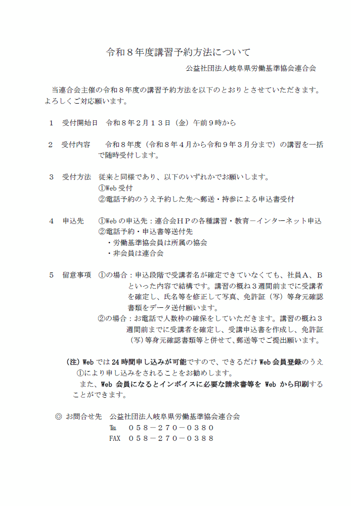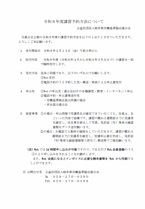 連合会主催の令和8年度の講習予約を令和8年2月13日(金)午前9時から開始します。
