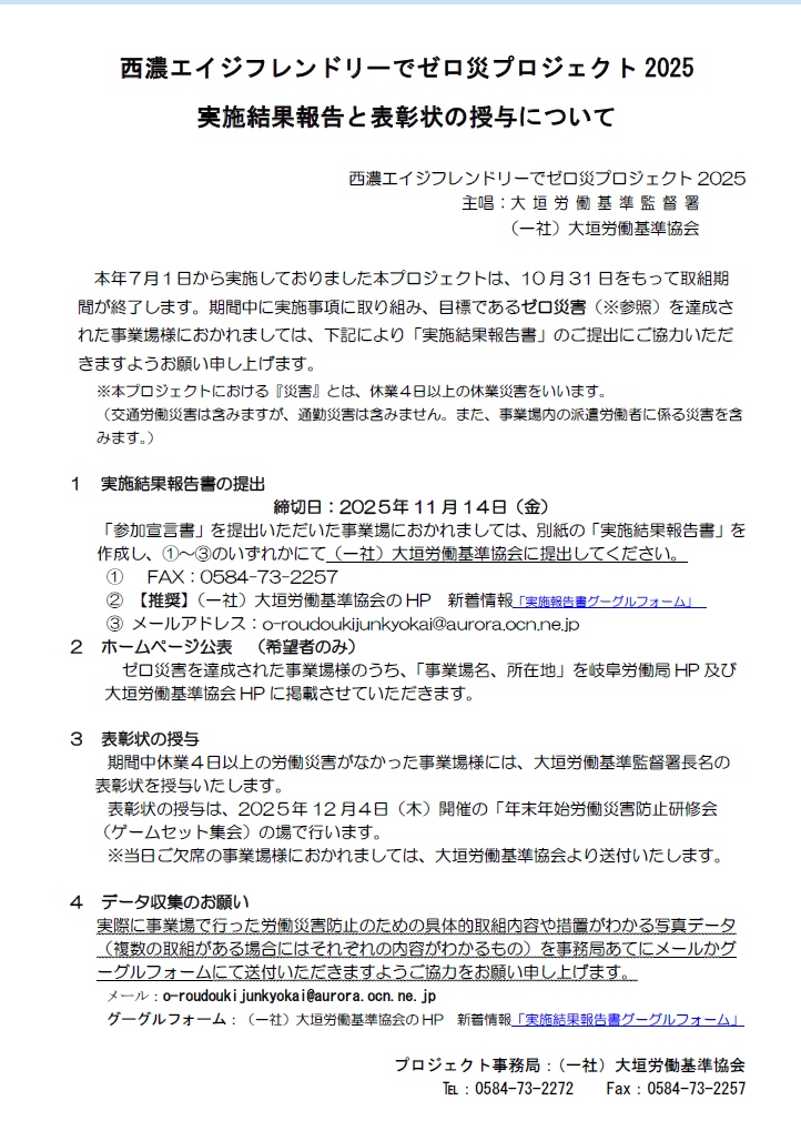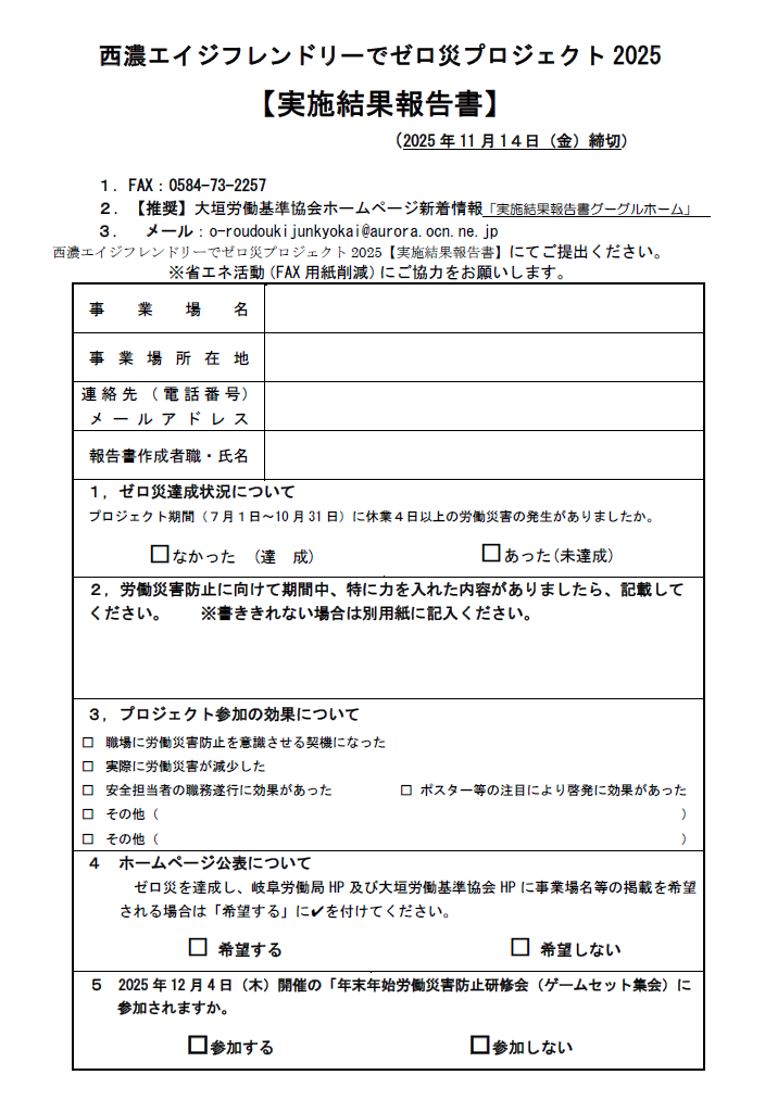 1 実施結果報告書の提出 「参加宣言書」を提出いただいた事業場様におかれましては、「実施結果報告書」を作成 (一社)大垣労働基準協会 事務局に提出する。 【提出方法】2025年11月14日(金)までに、以下のいずれかにて大垣労働基準協会あて提出してください。 項 目 FAX0584-73-2257 メール Googleフォーム 実施結果報告書 o-roudoukijunkyokai@aurora.ocn.ne.jp