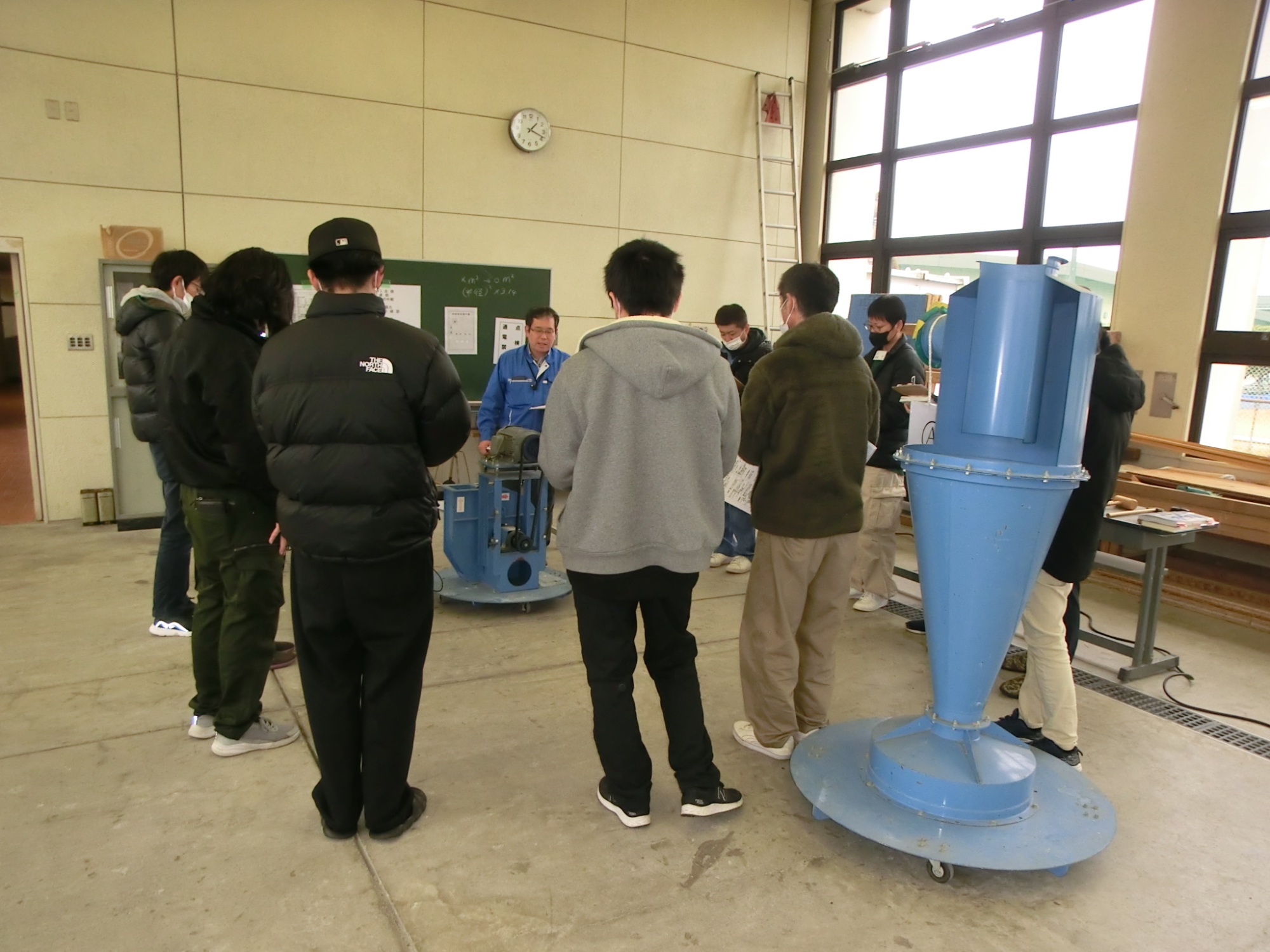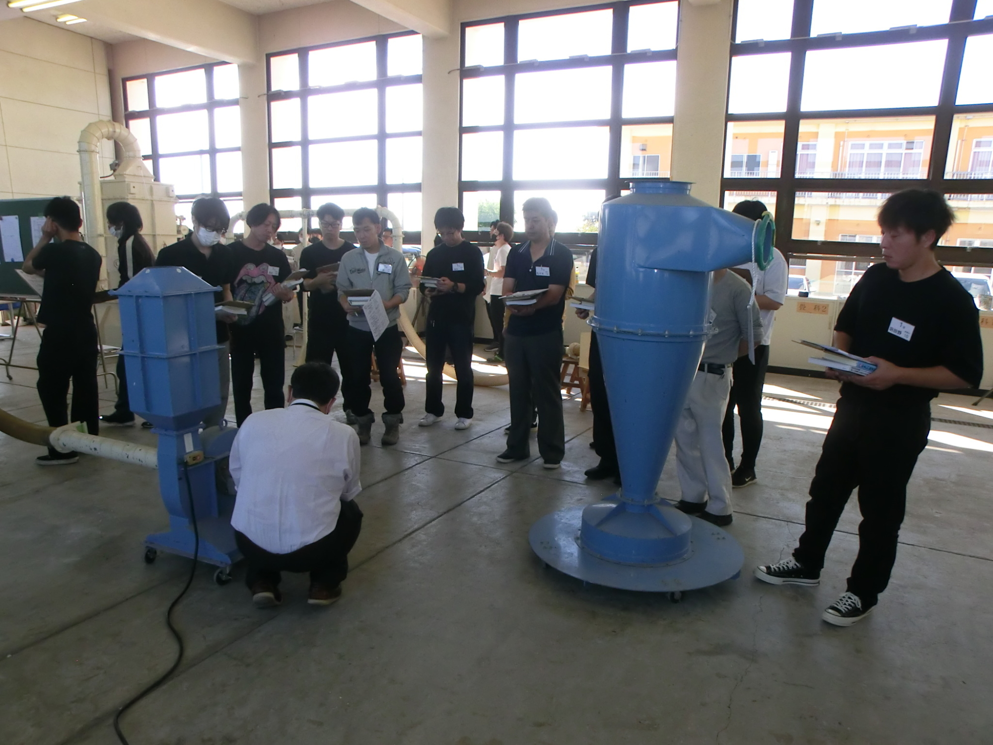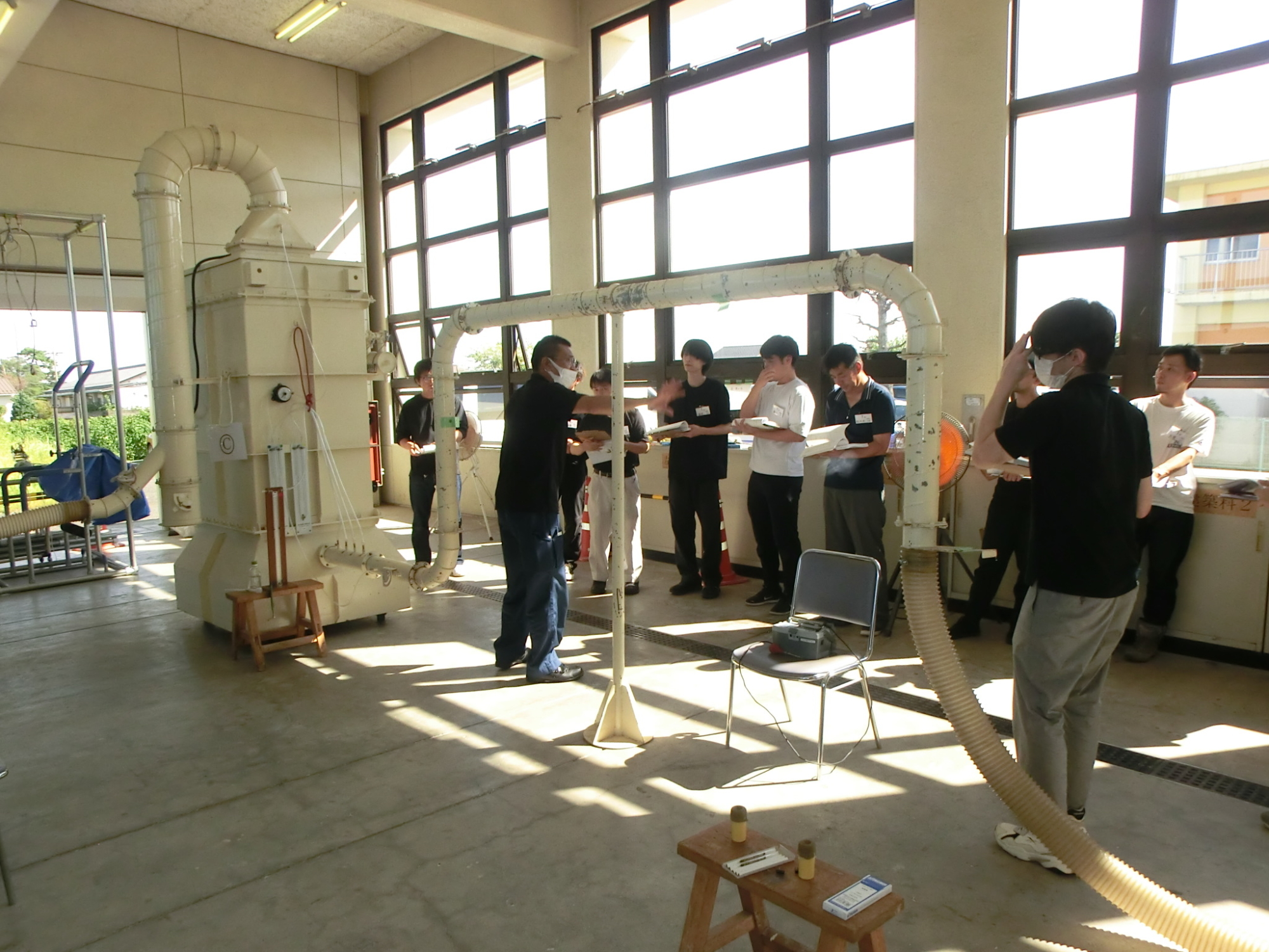 除塵装置ハウジング内のマノメーターにて静圧測定、スモークテスターを使用しての点検口の状態確認、風速計を使用しての送風量、排風量測定を実技を一日かけて実施し修了者に修了証をお渡ししました。