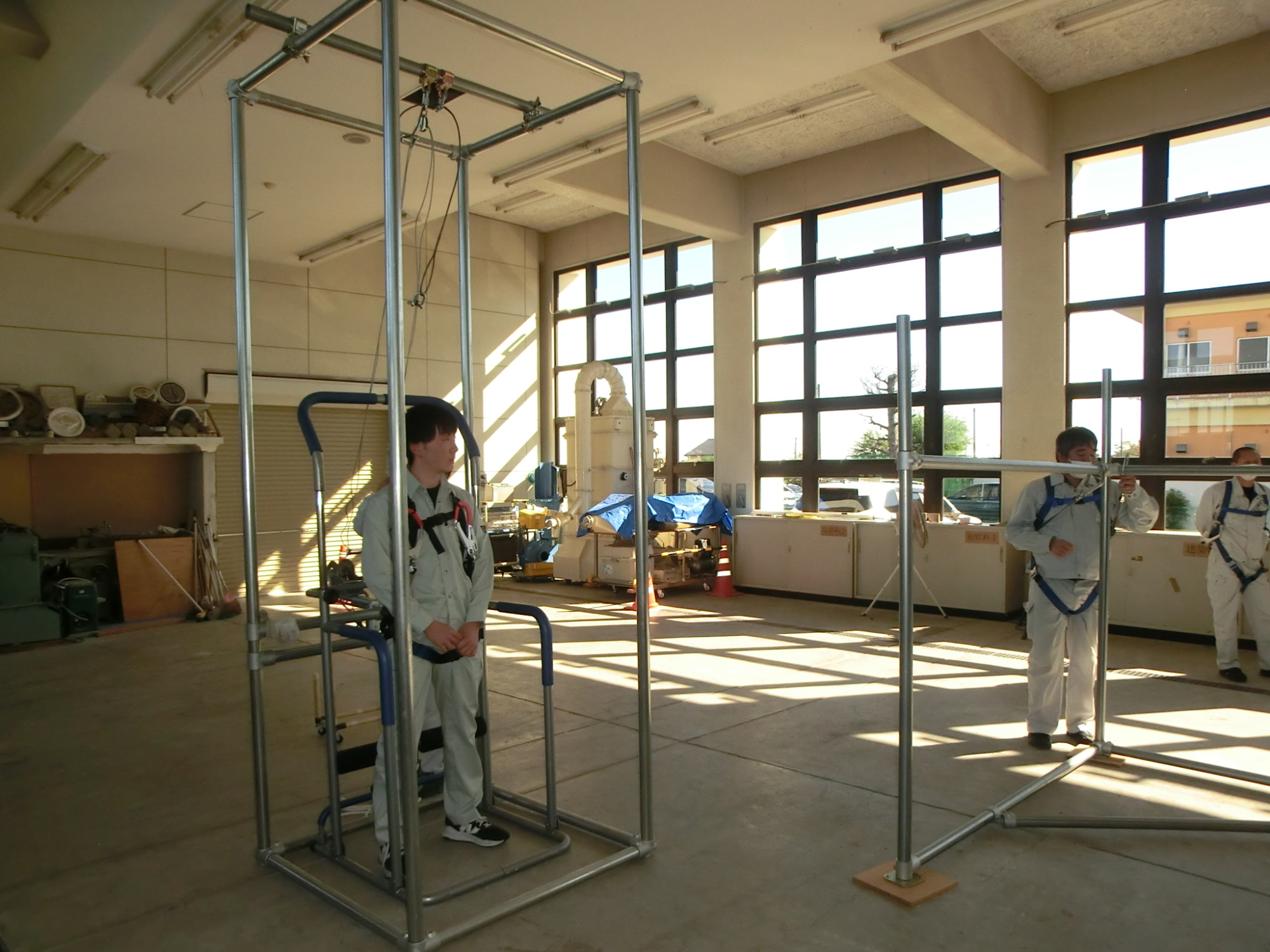 実技においては、墜落制止用器具にて釣り下がり体験をしてもらい、落下時の負荷を感じていただきました。